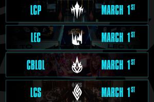 LPL在3月8号开赛,LCK、LCP、LEC、CBLOL、LCS都在3月1号开赛。