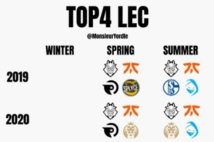 体育资讯2月25日讯 外媒统计2019年以来每赛季LEC前四队伍: