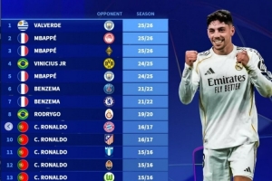 体育资讯3月12日讯 在本轮欧冠皇马3-0击败曼城的比赛中,巴尔韦德上演帽子戏法,这也是皇马球员第19次在欧冠做到这一点。德转也盘点了皇马队史在欧冠生涯帽子戏法的情况: