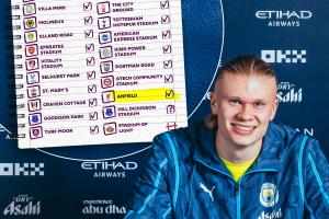哈兰德首次在安菲尔德进球,在英超赛场前往的25个球场中,他已攻破24个球场大门,只剩桑德兰主场未进球。