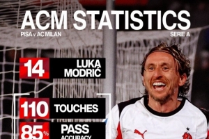体育资讯2月14日讯 意甲第25轮比赛,莫德里奇破门,米兰客场2-1击败比萨,米兰官方社媒晒出莫德里奇本场比赛的数据,配文:“大师风范。”