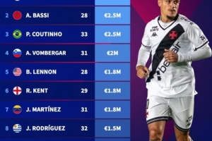 德转自由球员身价榜:库蒂尼奥250万欧第3,阿里仅剩100万欧第10