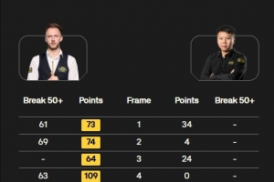 全场比赛特鲁姆普打出4杆50+和1杆破百,周跃龙最高分仅34分,遭到零封止步16强。
