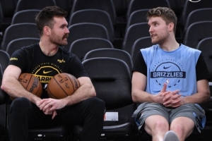 勇士主场迎战灰熊,赛前斯潘塞兄弟合影留念。